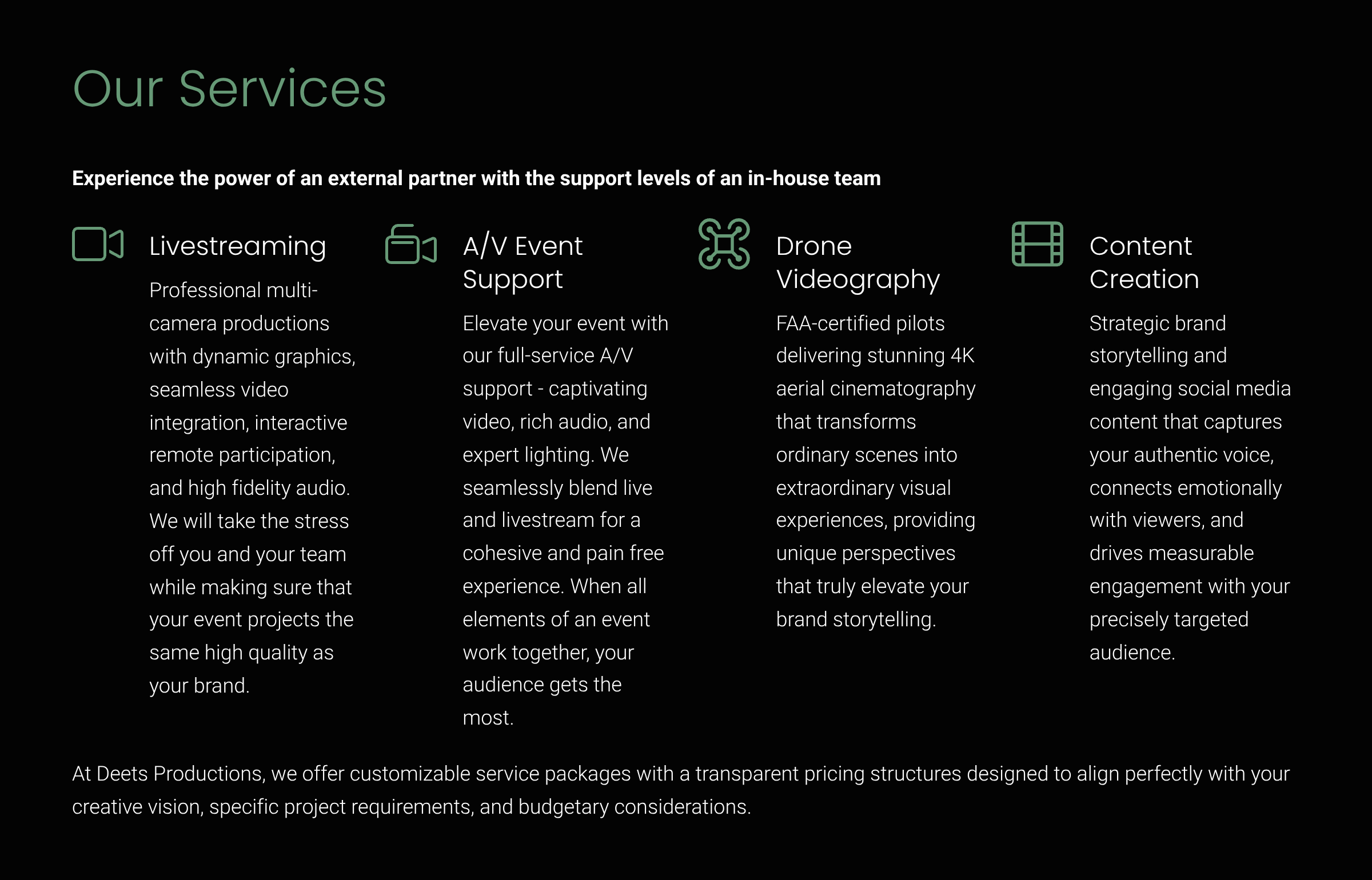 What really stands out is the way Josh builds relationships with his clients. He goes above and beyond to make sure everyone feels supported and valued, as if he’s an extension of our full-time staff. He is incredibly well-equipped to provide an array of services, making Deets a one-stop shop for any of your production needs, wants, or wildest dreams. You’re not just hiring a service with Josh - you’re gaining a trusted partner who’s invested in your success.